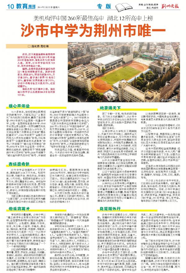 《荆州晚报》2月22日10版:专版报道我校进入美机构评定的中国260所最佳高中