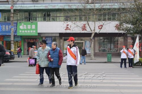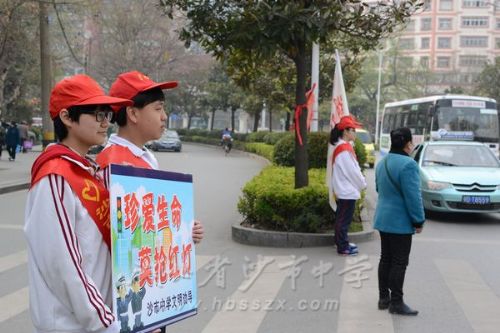 在校团委的组织下,学生志愿者身着整齐的校服,身挂红色绶带,头戴红色帽子,擎着团旗与校旗,举着宣传牌,张着宣传标语带,来到便河广场的十字路口和沙市中学的正门外,对来往的行人进行宣传和劝导。经过同学们三个小时耐心细致的劝导,周围的交通秩序有了明显的好转。此活动也受到来往市民的大力赞扬。