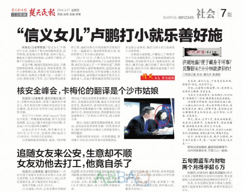 《楚天民报》3月27日报道我校92届学生鲁雪娜在核安全峰会上担任卡梅伦的翻译