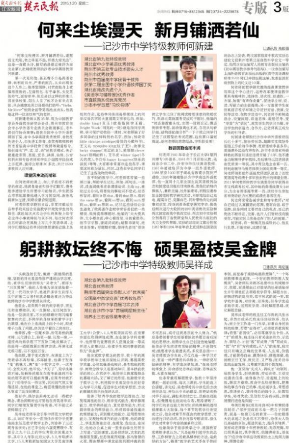 《楚天民报》2015年1月20日专版报道沙市中学特级教师何新建、吴祥成