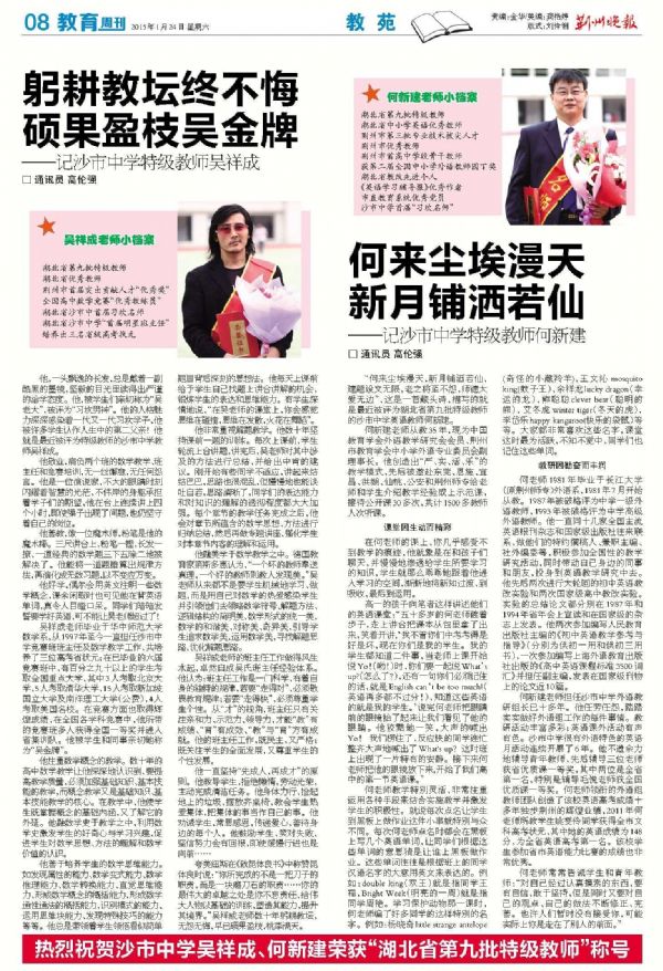 何新建老师从教35年,现为中国教育学会外语教学研究会会员、荆州市教育学会中小学外语专业委员会副理事长。他创造出“严、实、活、乐”的教学模式,先后被邀赴东莞、恩施、宜昌、洪湖、仙桃、公安和荆州师专给老师和学生介绍教学经验或上示范课,接待公开课30多次,共计1500多教师人次听课。