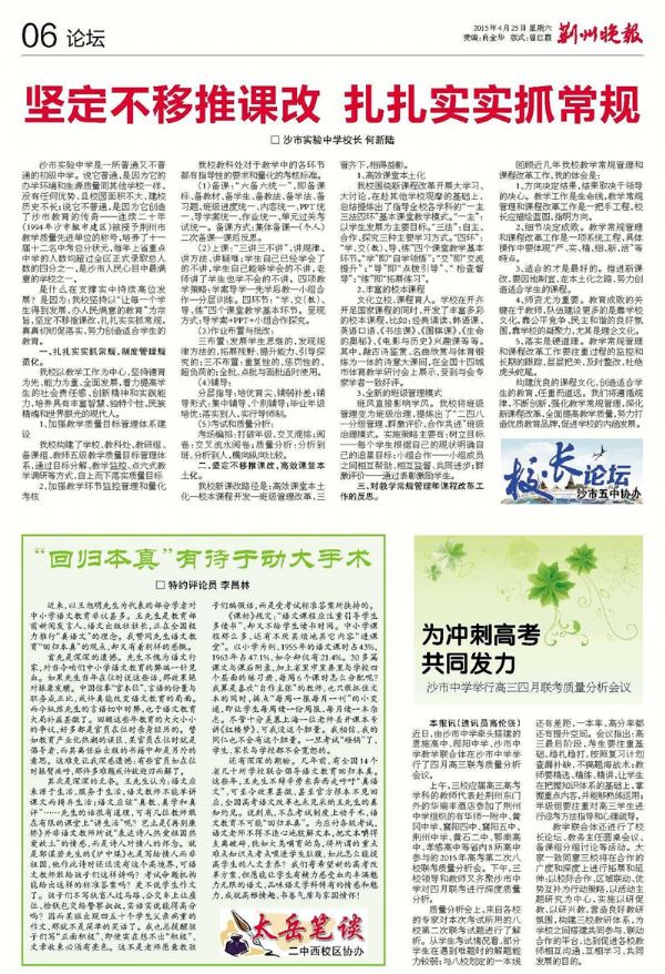 《荆州晚报》2015年4月25日报道我校组织三校教学联合体举行高三四月联考质量分析会议
