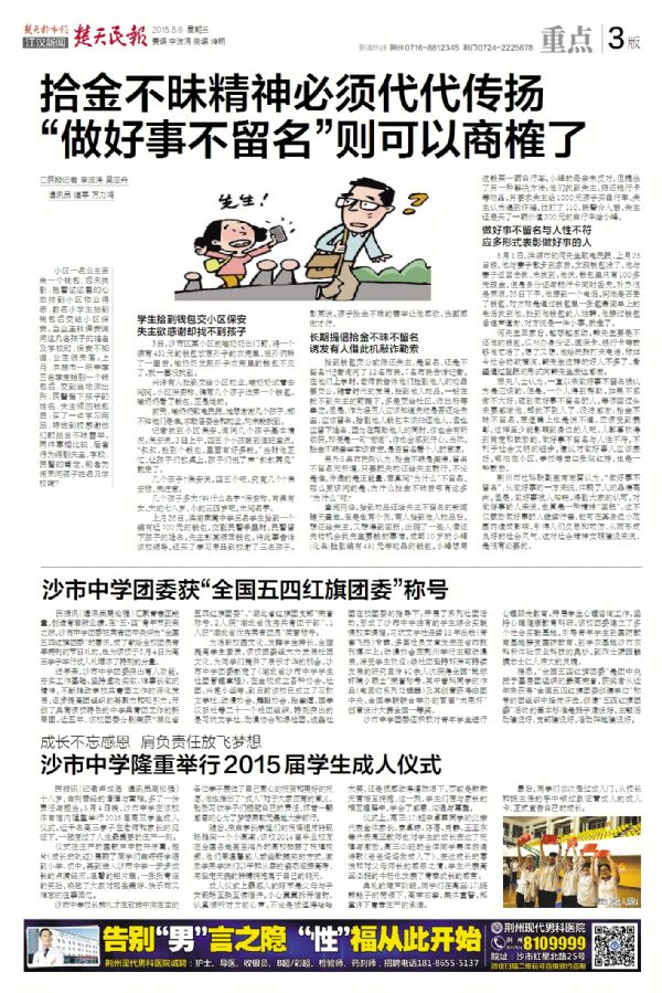 《楚天民报》2015年5月6日报道我校团委获得全国五四红旗团委称号和高三成人仪式