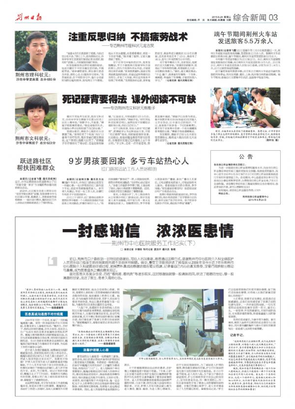 《荆州日报》2015年6月24日报道我校熊能子、龙吉昊分别斩获2015年高考荆州文理状元
