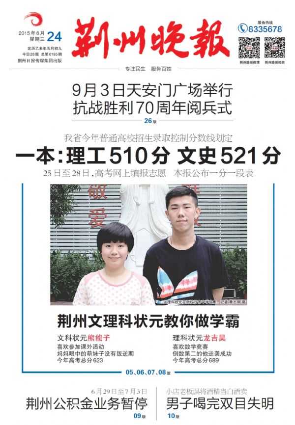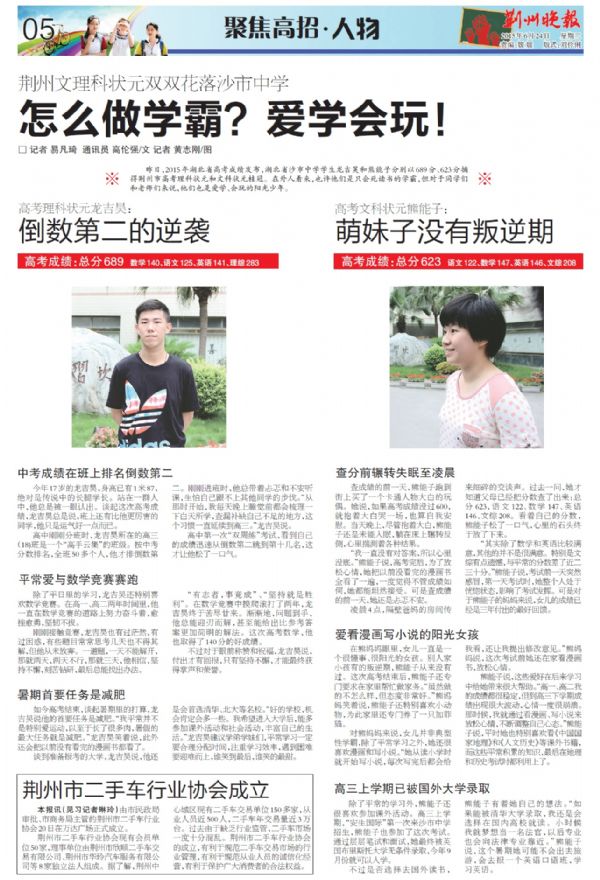 昨日,2015年湖北省高考成绩发布,湖北省沙市中学学生龙吉昊和熊能子分别以689分、623分摘得荆州市高考理科状元和文科状元桂冠。在外人看来,也许他们是只会死读书的学霸,但对于同学们和老师们来说,他们也是爱学、会玩的阳光少年。