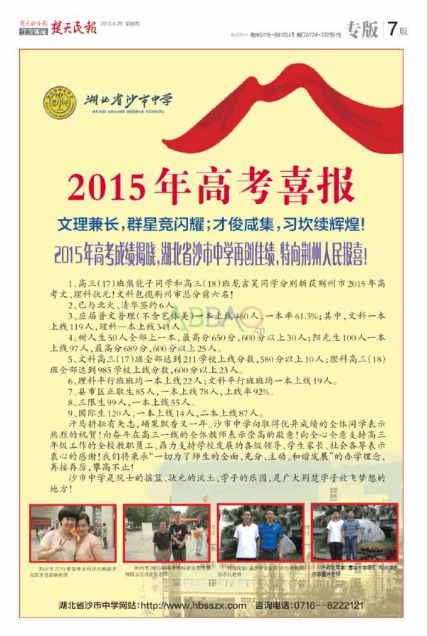《楚天民报》2015年6月25日刊登我校高考喜报