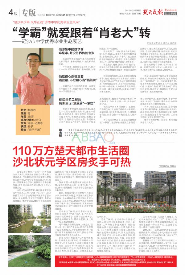 《楚天民报》2015年6月25日"沙市中学优秀毕业生风采"栏目报道我校学生赵展艺