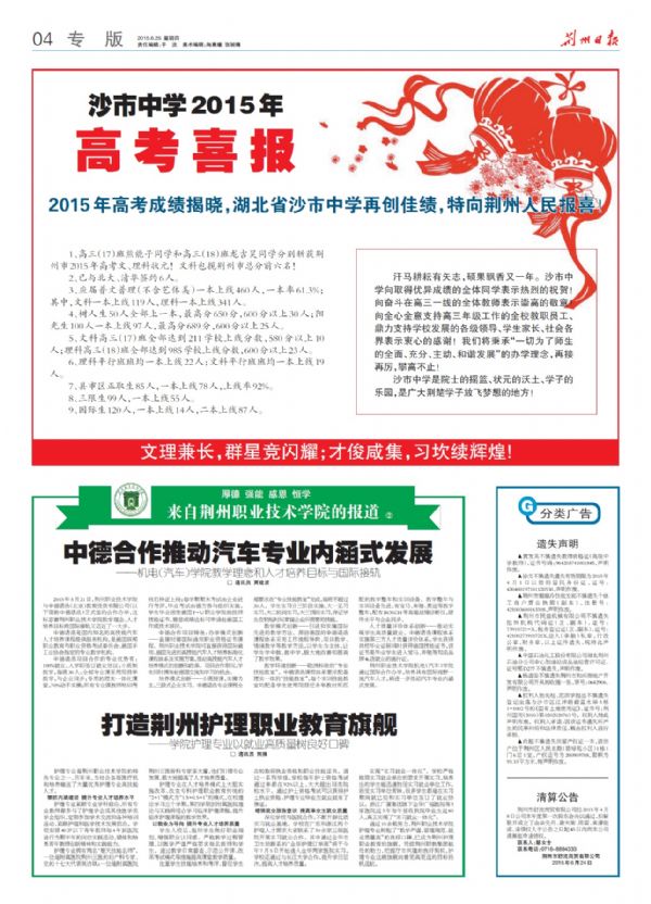 《荆州日报》2015年6月25日刊登我校2015年高考喜报