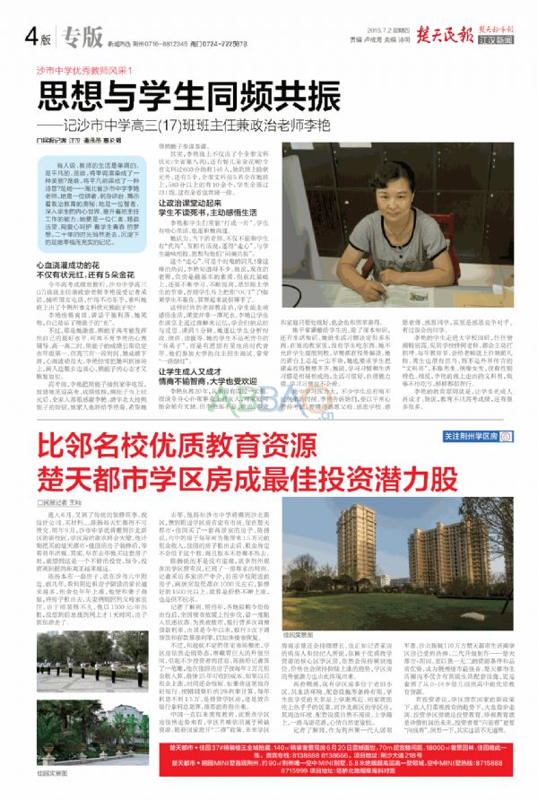 《楚天民报》2015年7月2日"沙市中学优秀教师风采"报道我校李艳老师