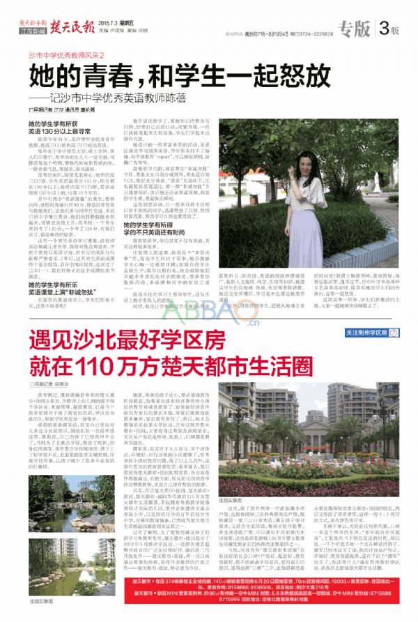 《楚天民报》2015年7月3日"沙市中学优秀教师风采"报道我校陈蓓老师