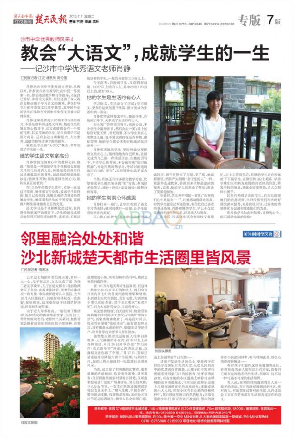 《楚天民报》2015年7月7日"沙市中学优秀教师风采"报道我校肖静老师