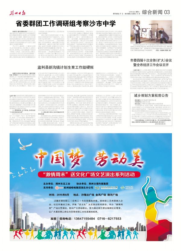 《荆州日报》2015年8月3日报道省委群团工作调研组考察沙市中学