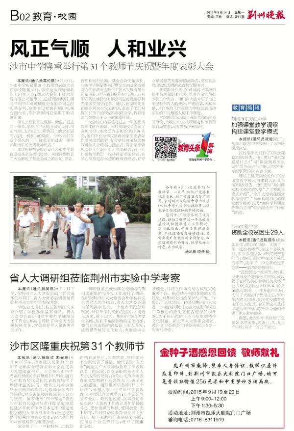 《荆州晚报》2015年9月14日报道我校教师节庆祝暨表彰活动