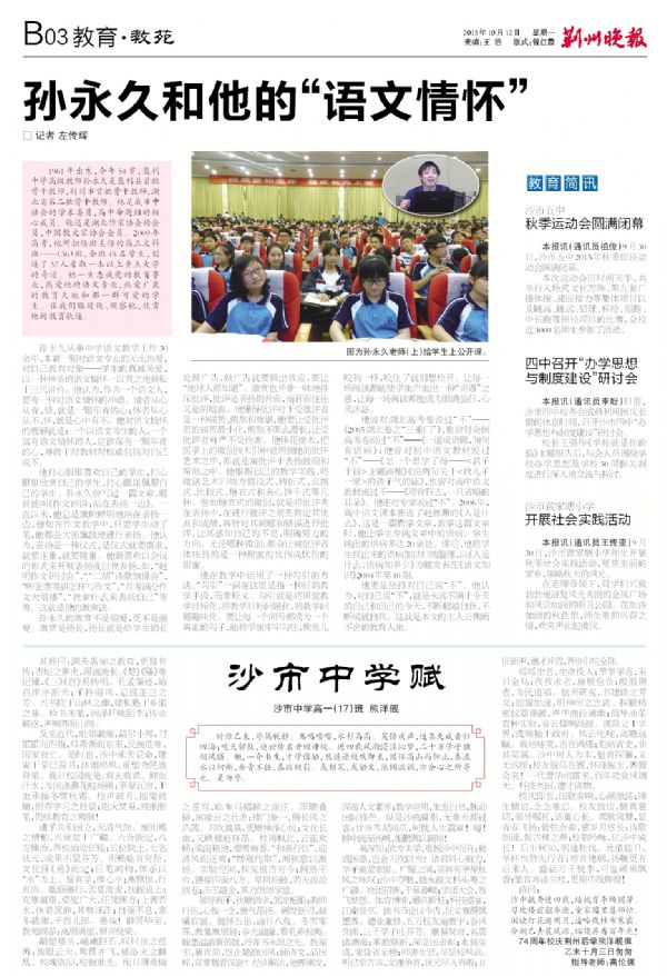 《荆州晚报》2015年10月12日发表我校1517班熊洋舰同学的《沙市中学赋》