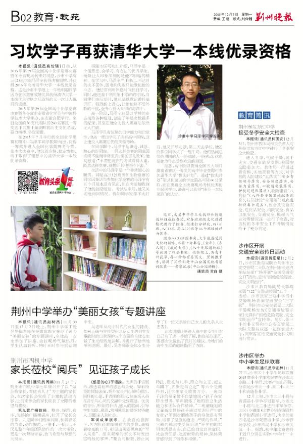 《荆州晚报》2015年12月7日报道我校学生马泽宇获得清华大学一本线优录资格