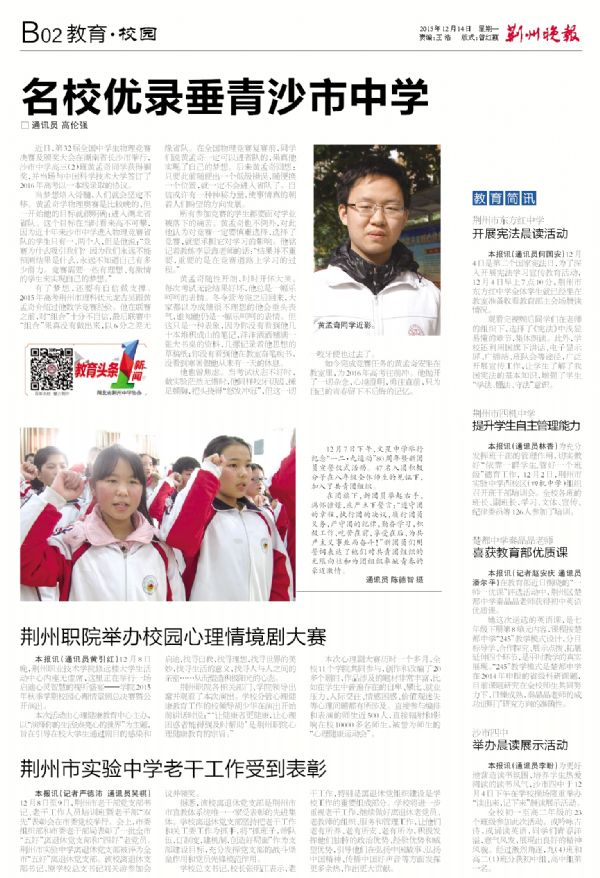 《荆州晚报》2015年12月14日报道我校黄孟奇同学获得名校优录资格