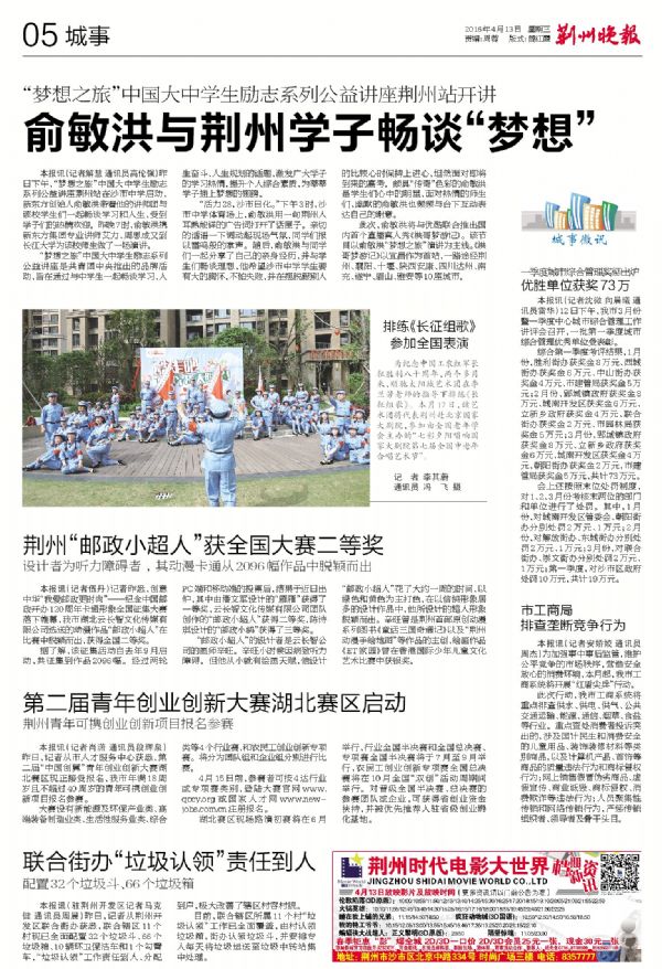 《荆州晚报》2016年4月13日报道俞敏洪到我校进行梦想之旅励志讲座
