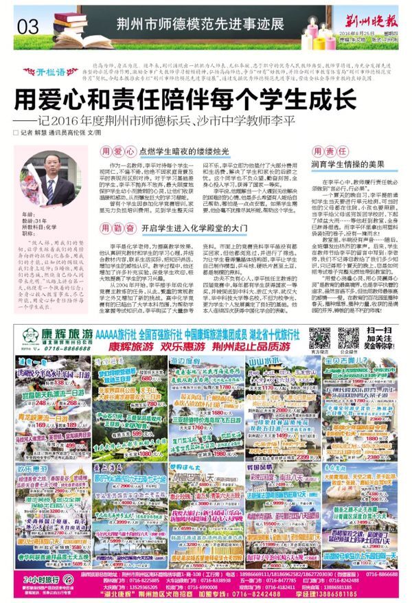 《荆州晚报》2016年8月25日专题报道市师德标兵、我校教师李平