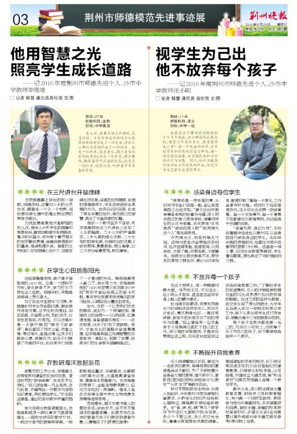——记2016年度荆州市师德先进个人、沙市中学教师汪小明记者解慧 通讯员高伦强 文/图