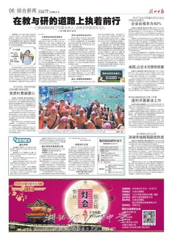 《荆州日报》2016年9月20日报道荆州市"名师工作室"主持人、我校教师张志礼
