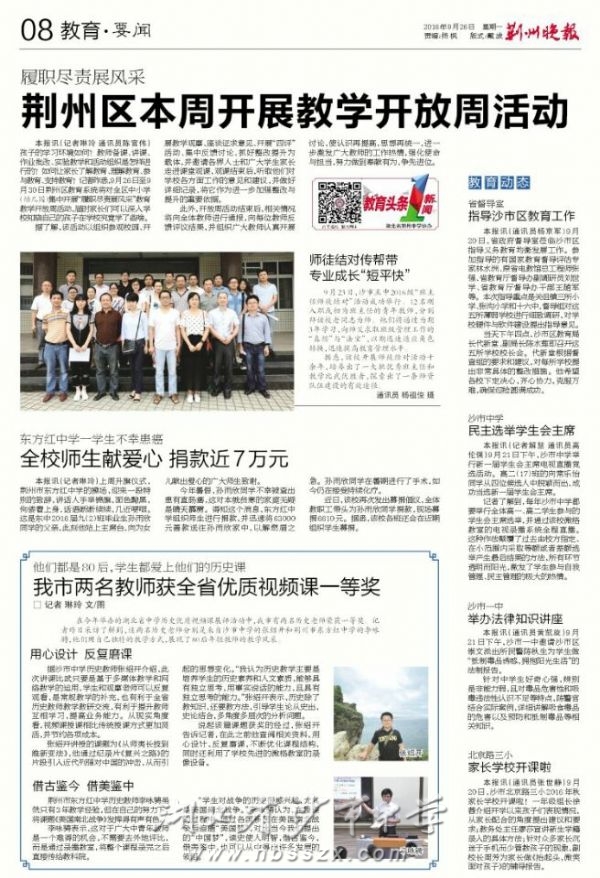 《荆州晚报》2016年9月26日报道我校民主选举学生会主席和张绍开老师获得省级赛课一等奖