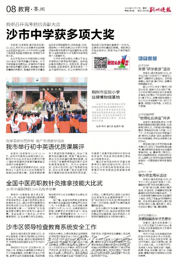 《荆州晚报》2016年10月17日报道我校2016年高考获得多项大奖