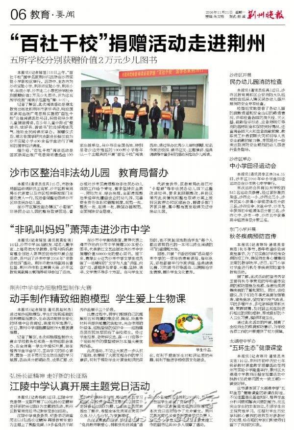 据悉, 开展 “书香进校园”活动是沙市中学的一项传统德育课程,每年秋天,该校都要举行作家讲座、经典诵读比赛、习坎读书节等活动,以期陶冶学生情操,提升学生文化素养。