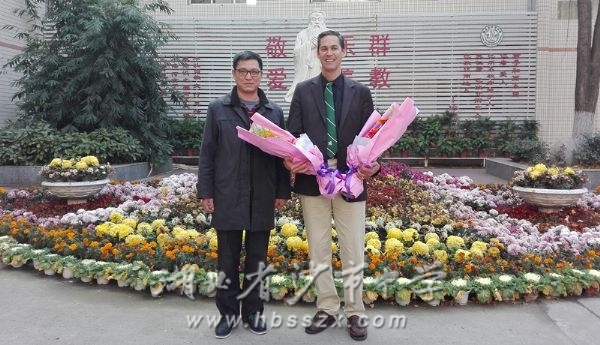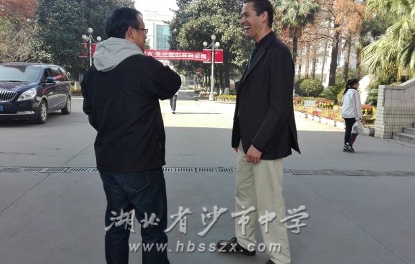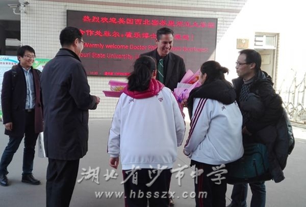 学生主动与Phil Hull 博士交流 周一上午,美国西北密苏里州立大学国际合作处Phil Hull博士到访我校。熊礼才校长率相关部门负责人在校门口迎接,表达了对来访嘉宾的热烈欢迎,学生代表向来宾献上鲜花。熊校长和Phill Hull博士来到校园内孔子雕像前,交流了孔子的教育思想和理念;Phil Hull 博士高兴地告诉熊校长,他在大学学习期间研读了孔子的教育著作,并对孔子的教育思想和理念有了一定的了解,此次来到沙市中学访问,瞻仰了孔子雕像,更加深了对中国文化的钦佩,同时,也更期待与沙市中学的交流与合作;随后,熊校长与来宾就沙市中学的国际合作办学、美国西北密苏里州立大学“少年班”(The Early-entance-to-college Program)沙市中学项目等交换了意见和看法,相互表达了合作的意愿,并在孔子雕像前合影留念。