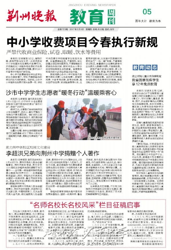 《荆州晚报》2017年2月9日报道我校志愿者"暖冬"行动