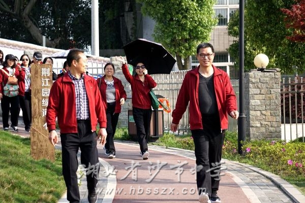 城上风光莺语乱,城下烟波春拍岸。刚刚经历了“雨下个不停”的荆州迎来了久违的阳光。燕子呢喃,飞絮蒙蒙,将这座南方小城打扮得古典中泛出几分秀雅和迷离。下午3:45,近200名老师身着统一的深红色运动服,从学校出发,沿着学校——新沙路——大湾——荆江大堤——临江仙公园的线路健步快走,唱响了“快乐健身,努力工作”的主旋律。4:30,老师们到达目的地。拂堤杨柳醉春烟,临江仙公园用最美的姿容迎接着辛勤的园丁们。他们或三五成群,或两两成对;或漫步,或静观,或清谈,或健身。矫健的身姿,惬意的笑脸,写满了他们对健康的追求,对运动的热爱和对美好生活的幸福感受。