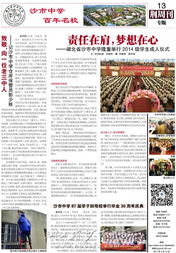 ——湖北省沙市中学隆重举行2014级学生成人仪式文/ 本刊记者何晓华 摄/何晓华 高伦强5月4日,正值中国青年节,也距离高考还剩1个多月,沙市中学为2014级高三学子隆重举行了主题为“成长、感恩、责任、梦想”的十八岁成人仪式,1000多名学子在家长的陪同下参礼。年满十八岁的学子,在父母和老师的共同见证下,以感恩之心领悟责任与担当,用激昂的誓言宣布他们已经长大成人。