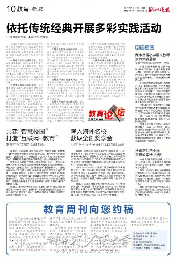 《荆州晚报》2017年5月22日报道我校高二学生录取世界名校