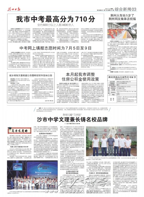 《荆州日报》2017年7月3日报道我校文理兼长铸名校品牌