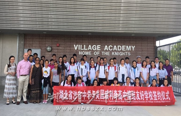 师生代表合影留念(二) 8月的沙市中学新校区洋溢着搬迁的喜庆气氛,而远在大洋彼岸的沙市中学2016级43名师生代表见证了百年沙中与美国蓝带高中——威利奇高中(Village Academy High School)建立姊妹学校的重要时刻。这不仅是沙市中学搬迁新校区的一份厚礼,更促进了沙市中学教育国际化发展。