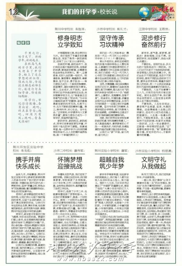 《荆州晚报》2017年9月1日刊登熊校长新学期谈话《坚守传承习坎精神》