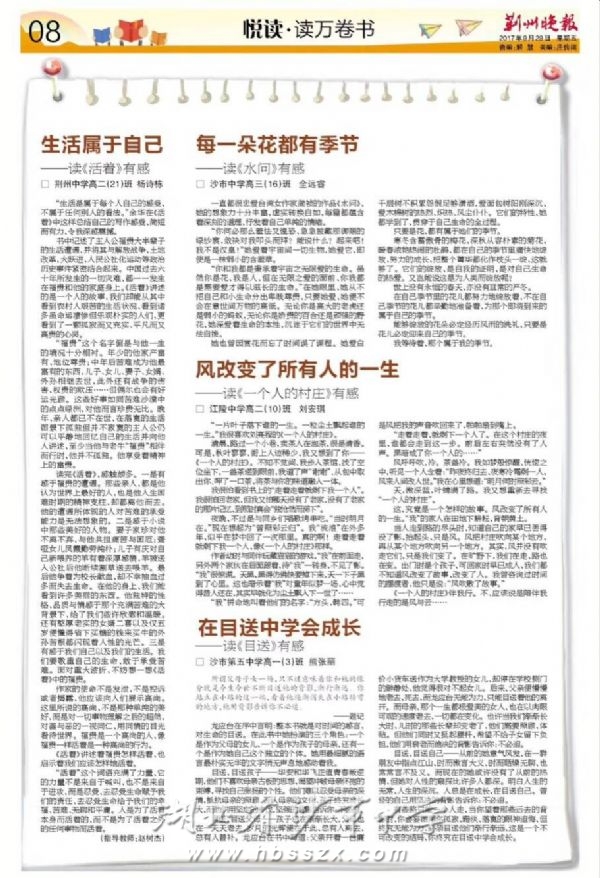 《荆州晚报》"教育周刊"2017年9月29日刊登我校学生读书心得