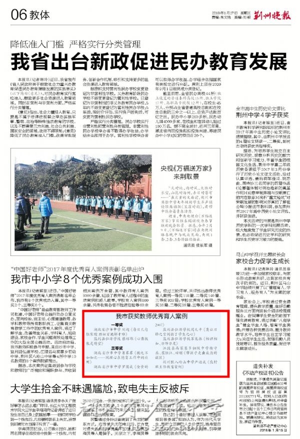 《荆州晚报》2018年1月17日报道我校教师获得"中国好老师"2017年度优秀案例奖