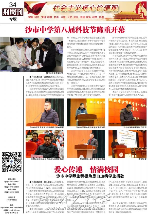 《荆周刊》2018年2月9日报道我校 科技节开幕和师生捐款救助重病学生