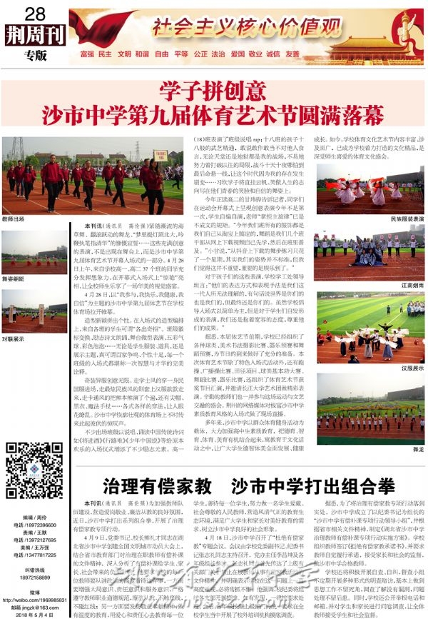 《荆周刊》2018年5月4日报道我校举办第九届体育艺术节和重拳治理有偿家教