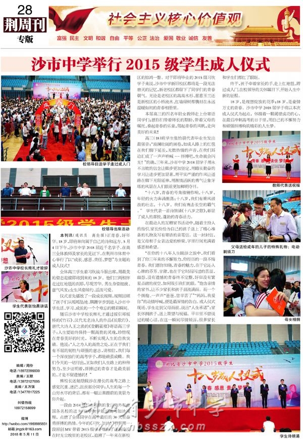《荆周刊》2018年5月11日专版报道我校高三学子成人仪式