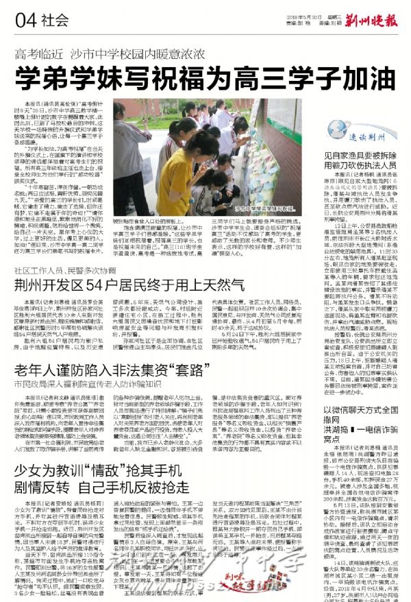 《荆州晚报》2018年5月30日报道我校学弟学妹写祝福为高三学子加油