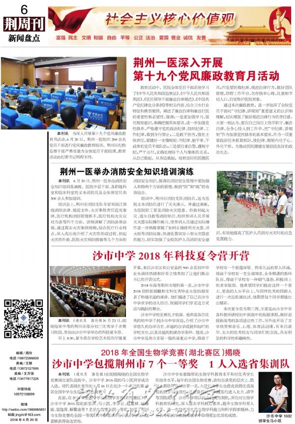 《荆周刊》2018年6月29日报道我校科技夏令营开营和生物竞赛取得优异成绩