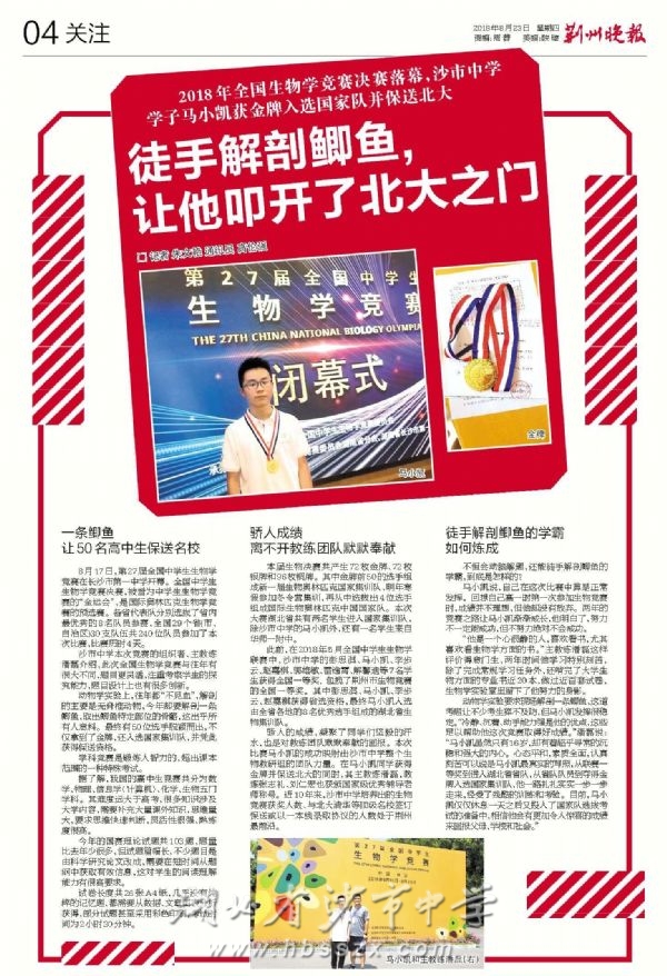 《荆州晚报》2018年8月23日专版报道我校学子徒手解剖鲫鱼叩开北大之门