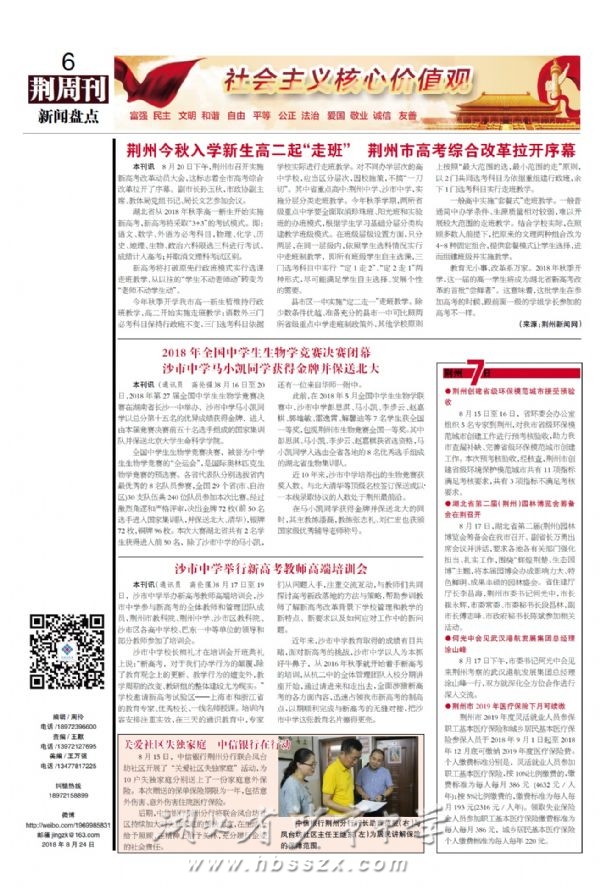 《荆周刊》2018年8月24日报道我校召开新高考教师培训会和马小凯保送北大