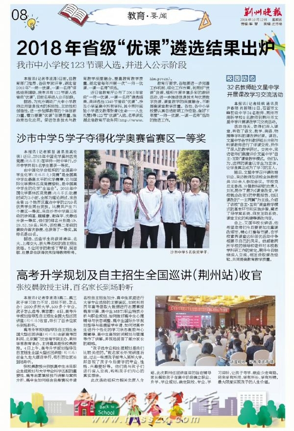 《荆州晚报》2018年10月12日报道我校5学子夺得化学奥赛省赛区一等奖