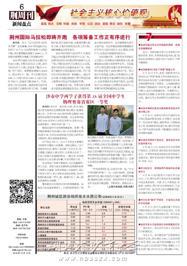 《荆周刊》2018年10月12日报道我校2学子夺得物理奥赛省赛区一等奖