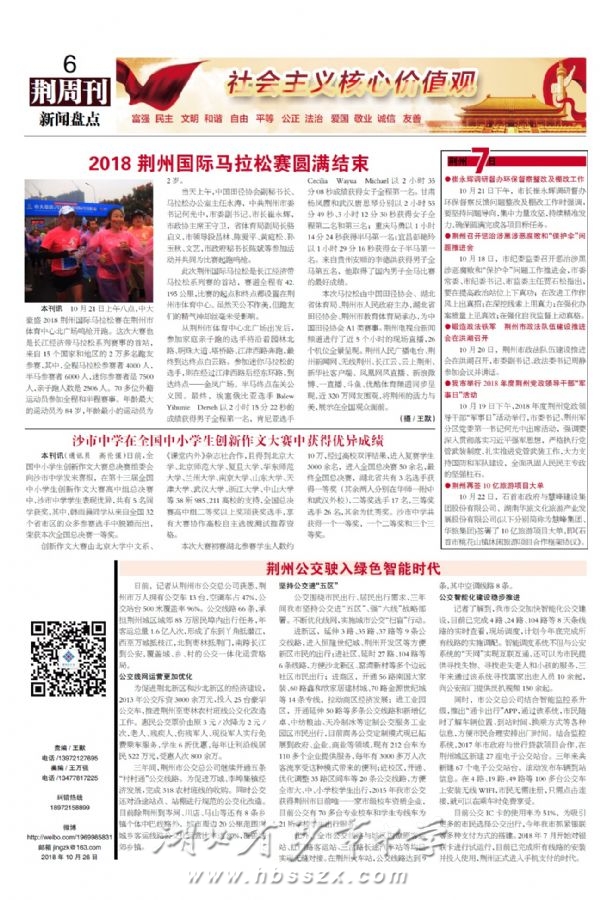 《荆周刊》2018年10月26日报道我校韩雨晨同学获得全国中小学生创新作文大赛一等奖