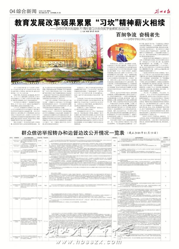 《荆州日报》2018年11月20日报道我校建校77周年校庆活动和熊校长的致辞