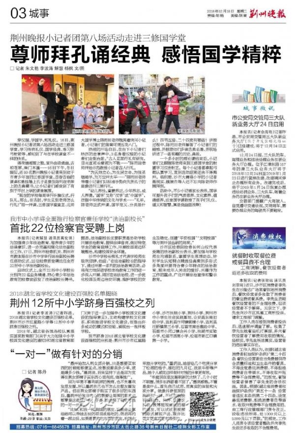 《荆州晚报》2018年12月18日报道市检察机关、市教体局聘任法治副校长启动仪式在我校举行