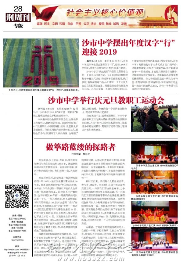 《荆周刊》2019年1月4日刊登熊校长新年讲话、报道我校教职工趣味运动会和组字迎新年